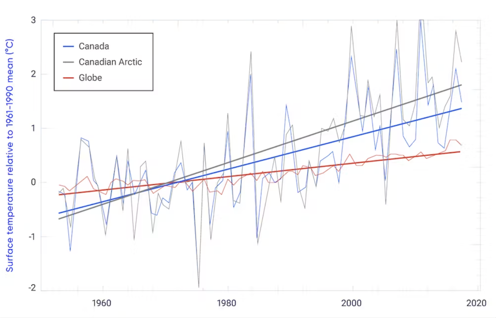The enhanced rates of warming over Canada and the Canadian Arctic are due to a unique combination of feedback mechanisms.