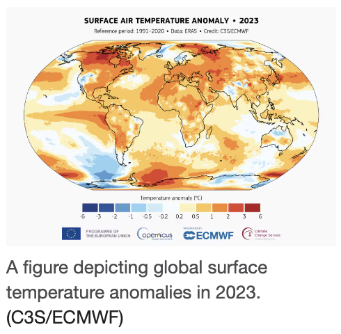 On Jan. 9, 2024, the European Union’s Copernicus Climate Change Service (CCCS) announced that their analysis confirmed that 2023 was the hottest year on record since 1850, when humans began burning fossil fuels at a major scale. The global average temperature was 1.48 C warmer than pre-industrial levels and much warmer (0.17 C) than 2016, the previous warmest year.