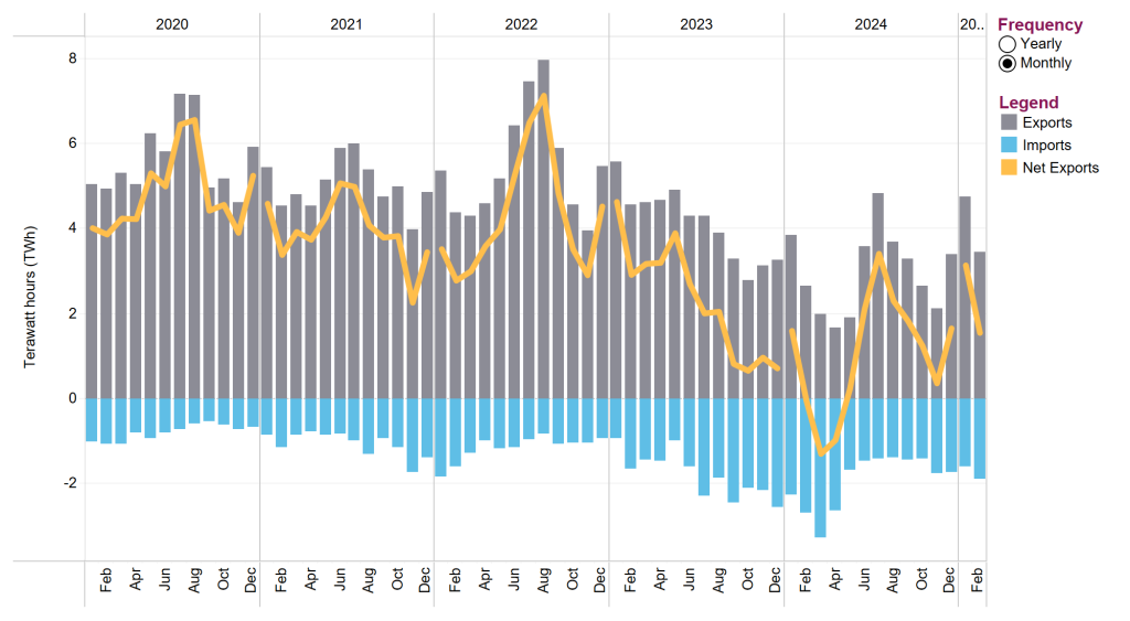 Text Alternative: This figure shows yearly and monthly electricity exports, net exports, and imports in Terawatt hours (TWh), over a four-year period up to February 2025. For the latest export and import volume data, including updates and revisions, please see the Commodity Statistics page. To see an animated version of this graph, click here.