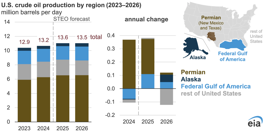 The EIA attributes the shift to uneven regional performance across U.S. basins. Although modest gains are expected in Alaska, the Federal Gulf of Mexico and parts of the Permian Basin, those increases will be offset by declines in other major producing regions. Production in 2024 grew by 300,000 b/d, followed by a 400,000 b/d increase in 2025, driven primarily by the Permian Basin in Texas and New Mexico, which remains the country’s most prolific oil-producing region.