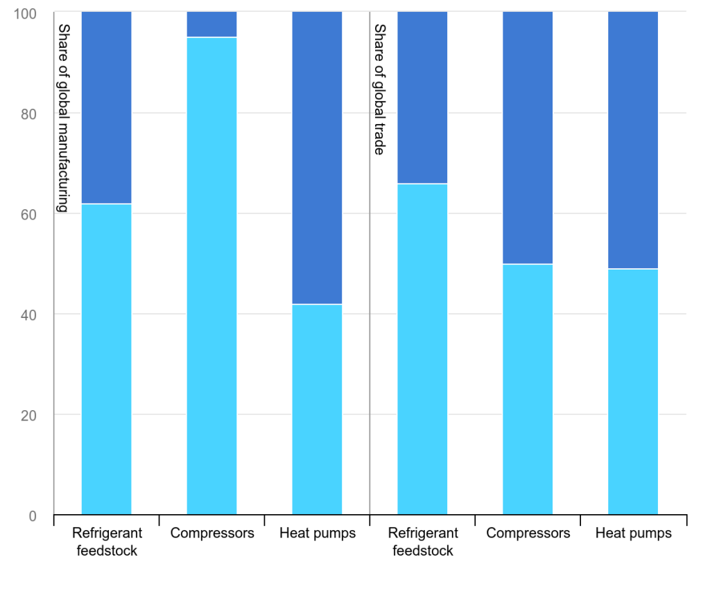 China not only holds the largest share of manufacturing capacity for heat pumps, but also for certain heat pump components. In 2023, China accounted for 95 per cent of compressors manufactured, and 50 per cent of the compressors traded worldwide in monetary terms.