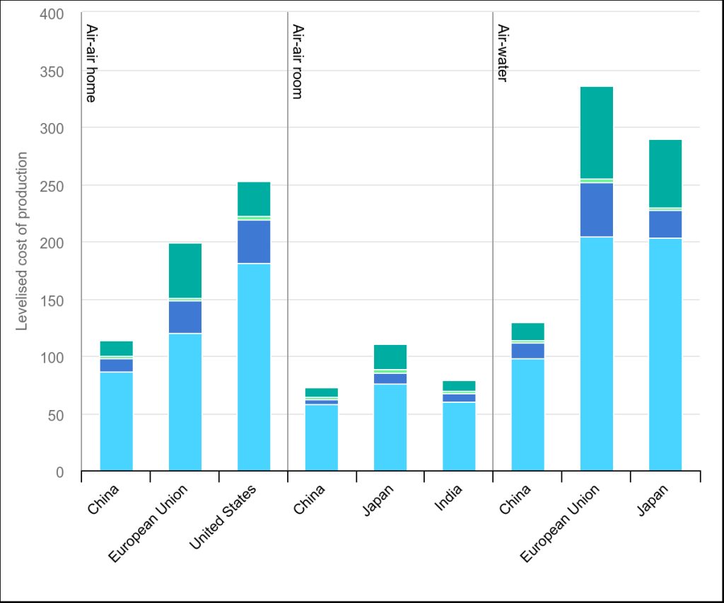 Levelized cost of production for heat pumps in selected countries/regions by type, 2023