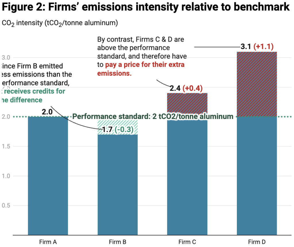Instead of pricing emissions from a firm’s inputs—like the diesel or coal it uses—LETS price the emissions associated with a firm’s output, such as tonnes of cement or steel. But firms only pay the carbon price if they exceed a certain threshold of emissions intensity (these thresholds are usually called performance standards or benchmarks, and they can vary by product, facility, or sector). Firms that emit above the threshold have to buy credits to cover their excess emissions. Firms that meet the threshold are not liable for the carbon price. And firms that emit less than the threshold generate credits that they can sell to the other firms for a profit.